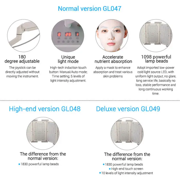 Model GL047 contains 1098 lamp beads, while models GL048 and GL049 have 1830 lamp beads, ensuring effective therapy.