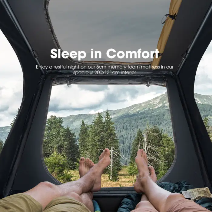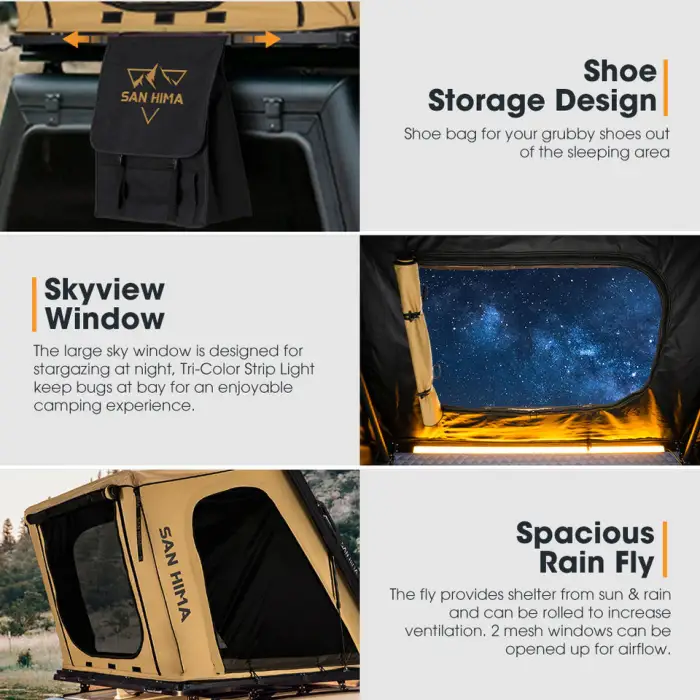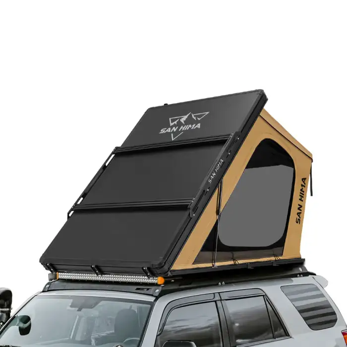 The SAN HIMA roof top tent features quick automatic opening, allowing for easy setup in just a few minutes. Simply unfold and secure it to your 4WD vehicle.