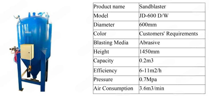 The Sandblasting Tank (Dry) includes 1 ton of steel shot, 1 ton of steel grit, and spare parts which consist of a 17m sand pipe, an 18m air pipe, and a sandblasting gun.