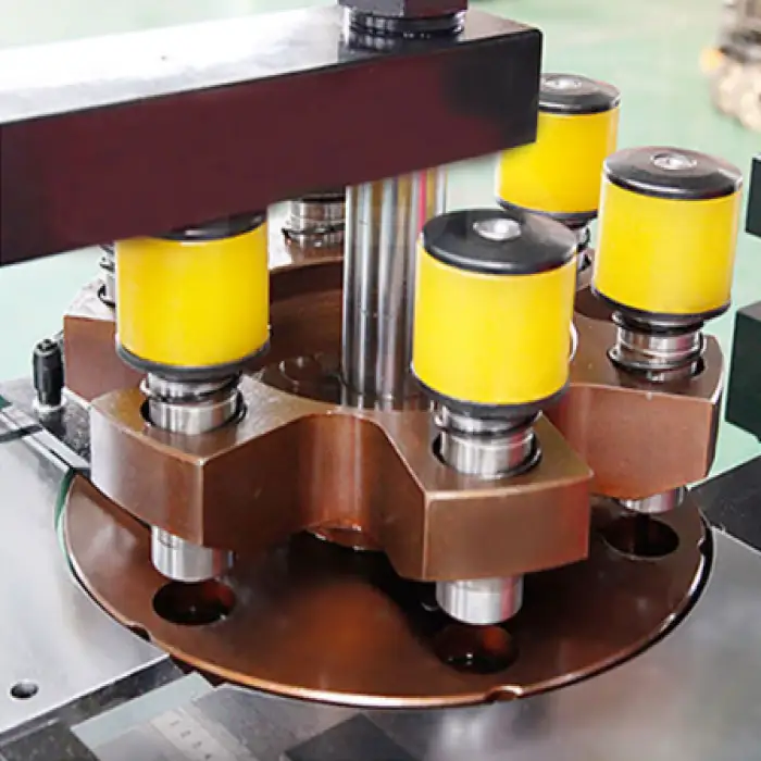 The machine performs cutting, bending, and punching of busbars.