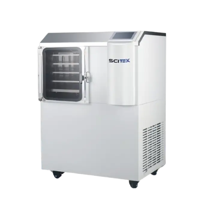 The SCITEK FD-P3S is a pilot-scale freeze dryer with an acrylic transparent door designed for freeze-drying both liquid and solid samples in laboratories, research facilities, and small production settings.