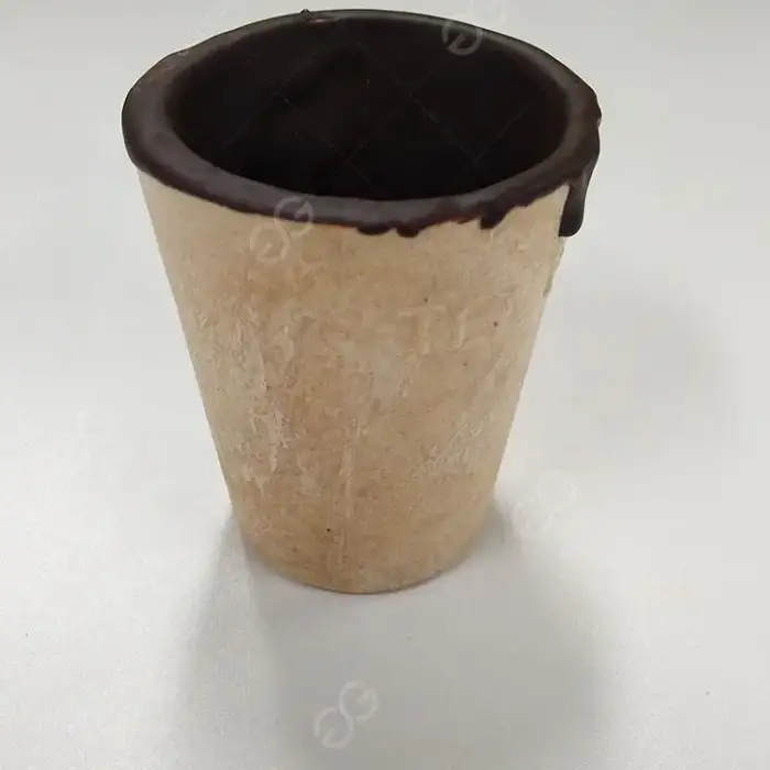 Yes — the machine can produce edible cups from a variety of batter or dough recipes (waffle, cookie, chocolate-based). You may need to adjust temperature, cycle time and coating parameters to suit different formulations.