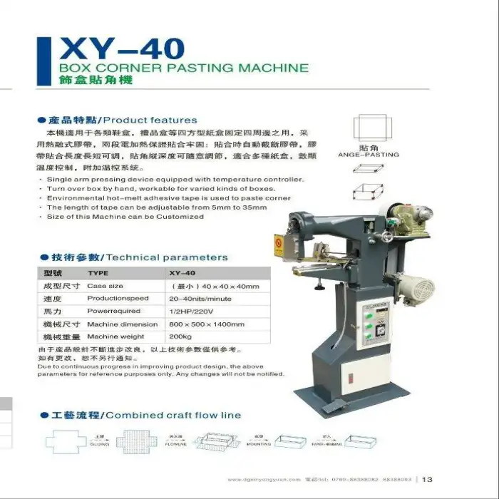 Key features include efficient corner pasting for sturdy boxes, easy operation, compact design for convenient placement, high working speed, and durable construction.