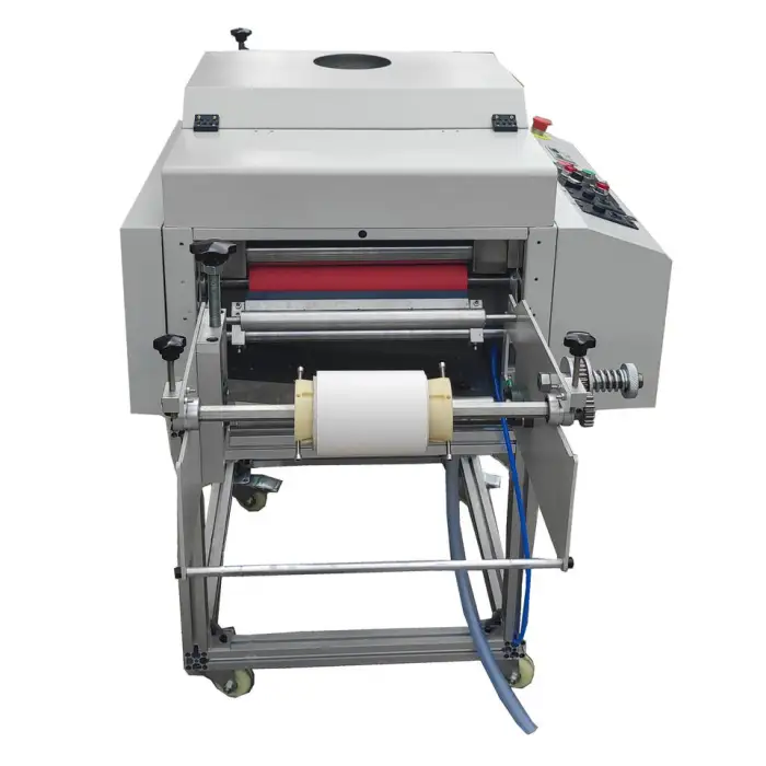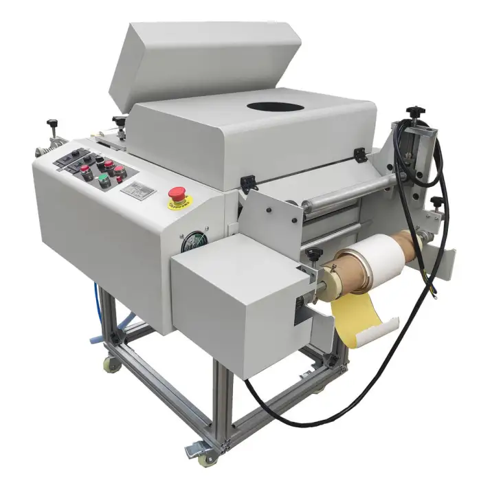The machine utilizes a UV light drying system, which efficiently cures the UV coating applied to the materials.