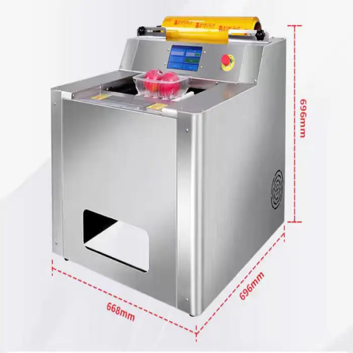 The Semi-automatic Vegetable Food Roll Stretch Cling Film Wrapper is designed for various food items, including fruits, vegetables, meat, and prepared meals.