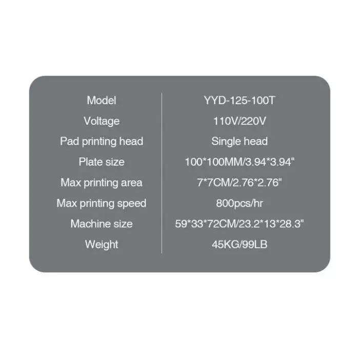 The standard package includes the pad printing machine itself, along with necessary accessories for operation.
