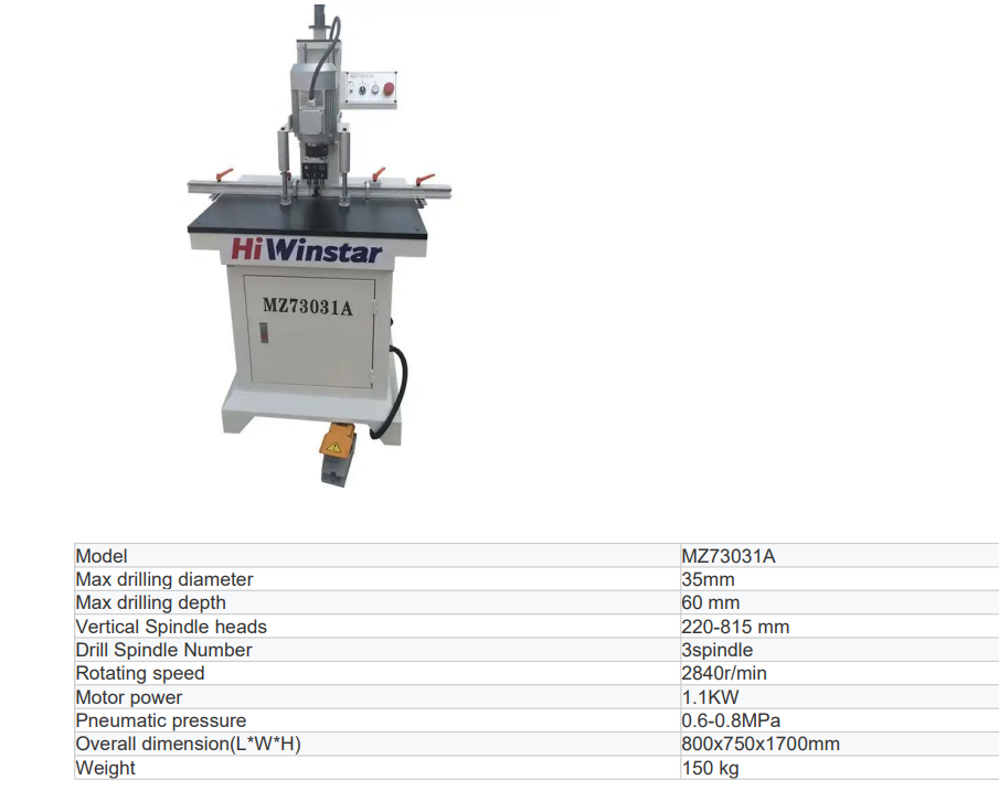 The Single head hinge drilling machine - Model: MZ73031A is designed for precise drilling of hinge holes in wooden and metal materials, making it ideal for furniture and cabinet manufacturing.