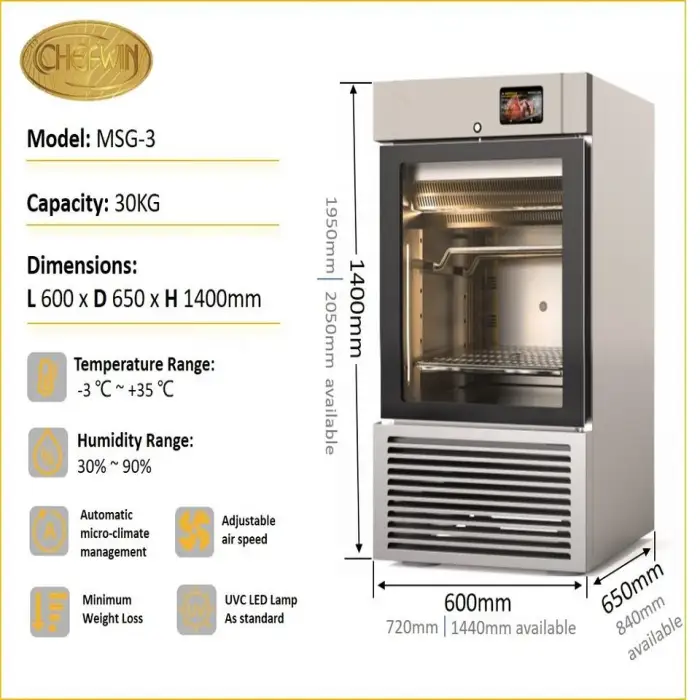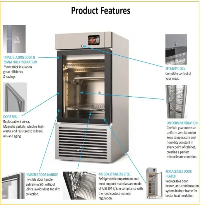 The efficient fan cooling system ensures even temperature distribution throughout the cabinet, maintaining optimal conditions for dry aging.