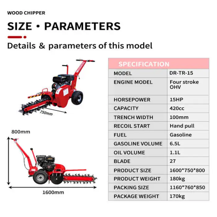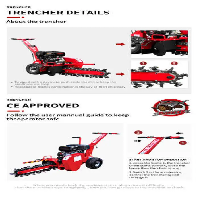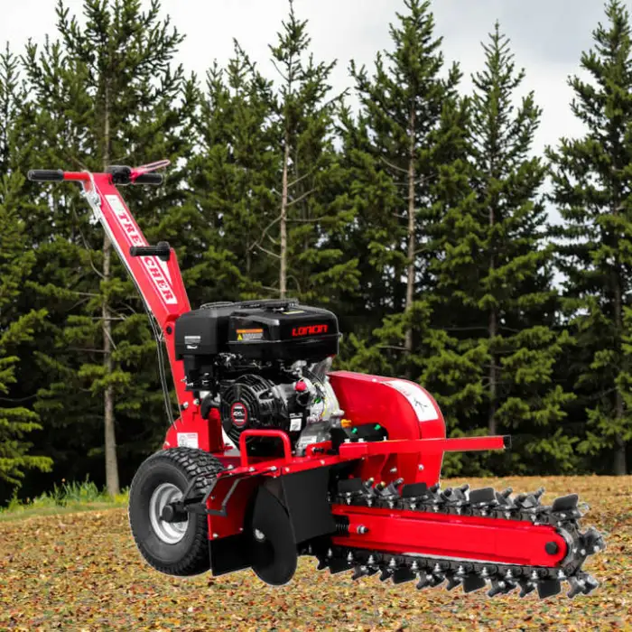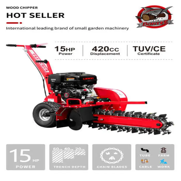 It is designed for field construction, landscaping, garden preparation, utility installation (cables and pipes), and general excavation where narrow trenches are required.
