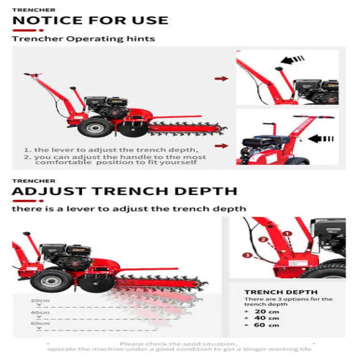 The Small Chain Trencher 15HP supports three adjustable trench depths: 200 mm, 400 mm, and 600 mm.