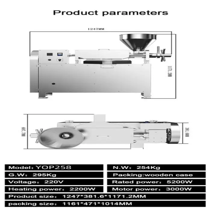 The machine weighs 254 kg, making it a robust and stable option for oil extraction.