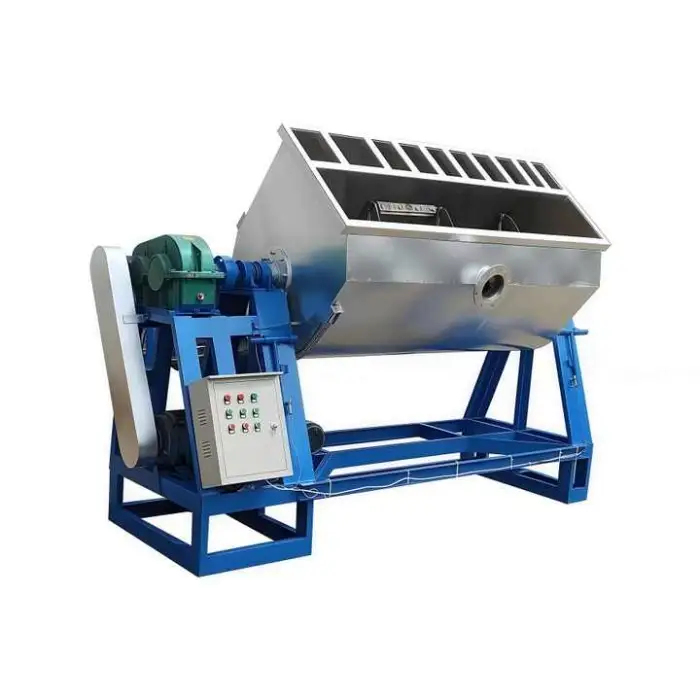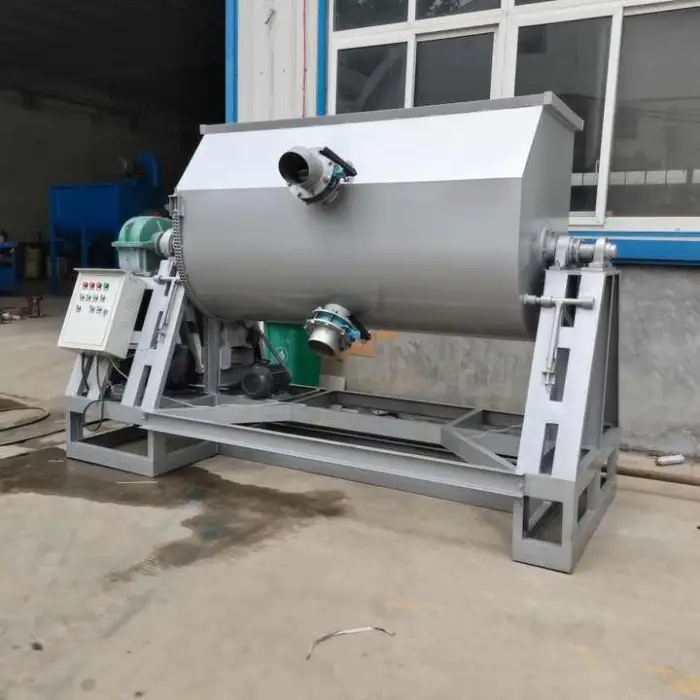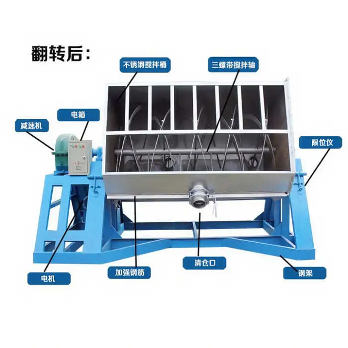 The ribbon blender uses a horizontal ribbon screw to mix powders efficiently, ensuring a homogeneous mixture in a short amount of time.