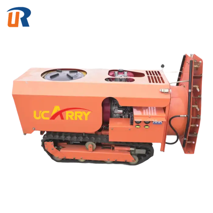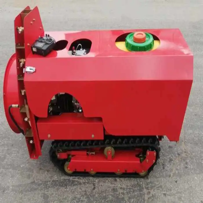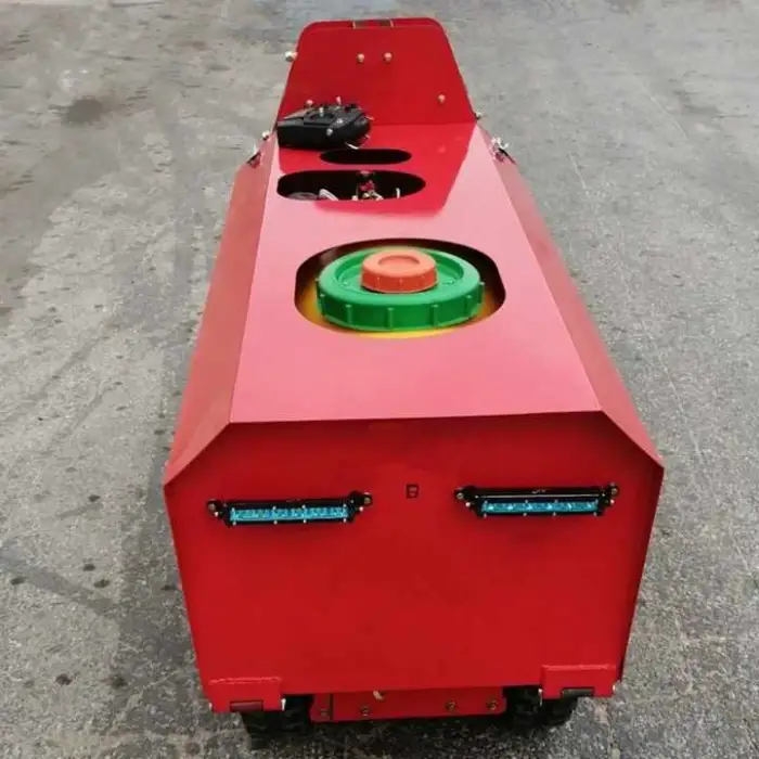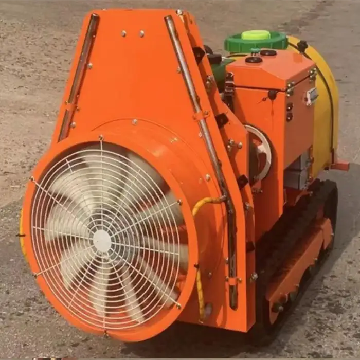 The flexible crawler design provides smooth movement across uneven terrain common in orchards, improving stability and traction compared with wheeled units.
