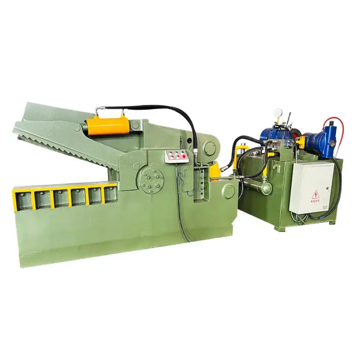 The machine is designed to cut through various types of metals, including steel, aluminum, copper, and other scrap metals efficiently.