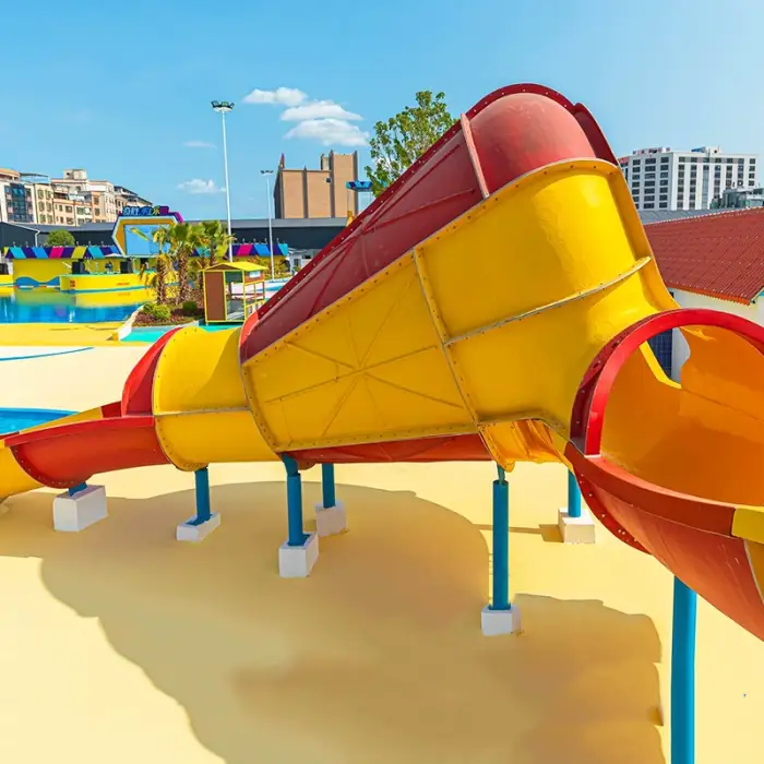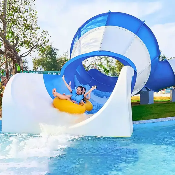 The slide is constructed from FRP fiberglass (fiberglass-reinforced plastic) with a supporting steel structure for strength and durability.