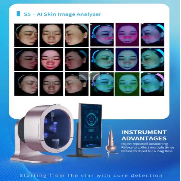 The device utilizes advanced technology including 3D topography and AI to analyze skin conditions. It provides detailed insights on skin moisture and other factors through its 10.1 inches touch screen interface.