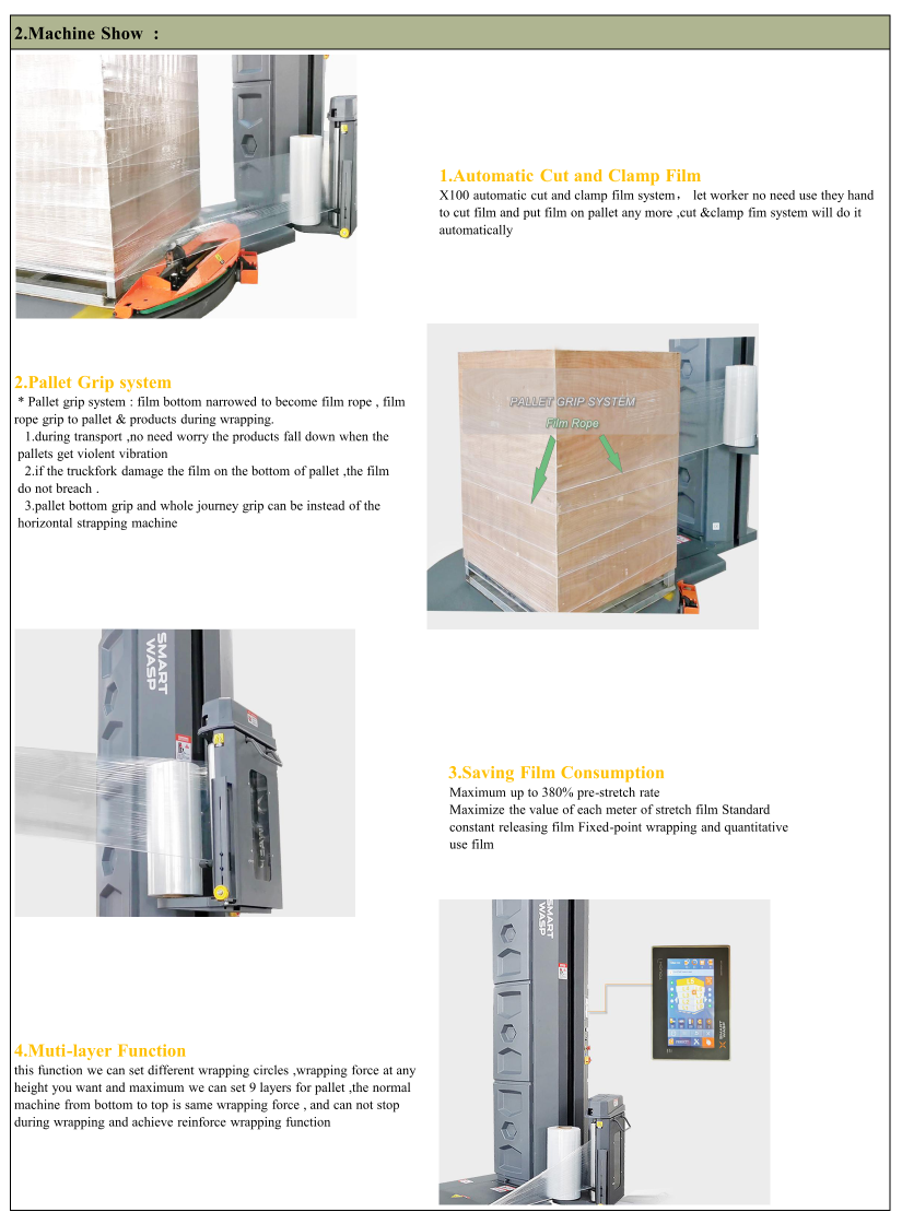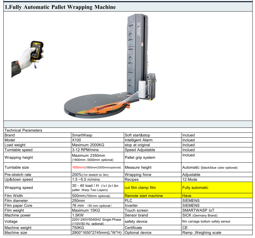 The Smart Wasp X100 is a fully automatic machine designed for wrapping pallets with stretch film, enhancing efficiency and protection during storage and transportation.