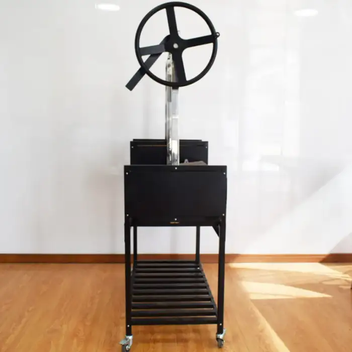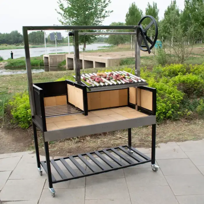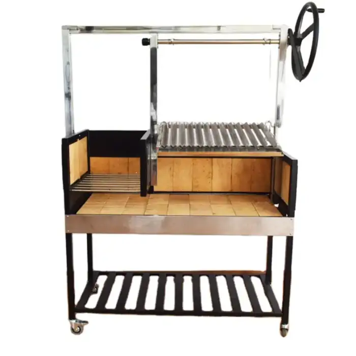The grill features removable components, such as skewers and drip trays, making it easy to clean and maintain.