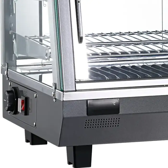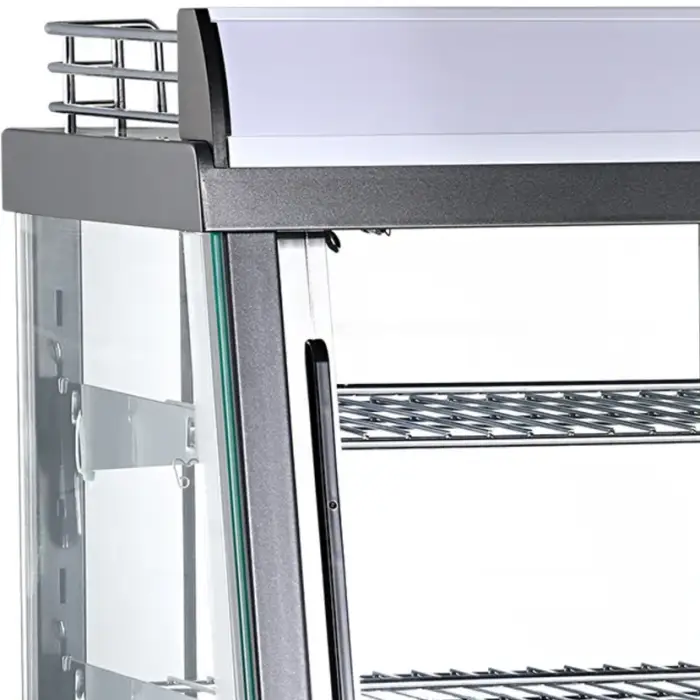 The warmer features a 4-side glass display that allows customers to view the food from all angles, enhancing presentation and visibility.