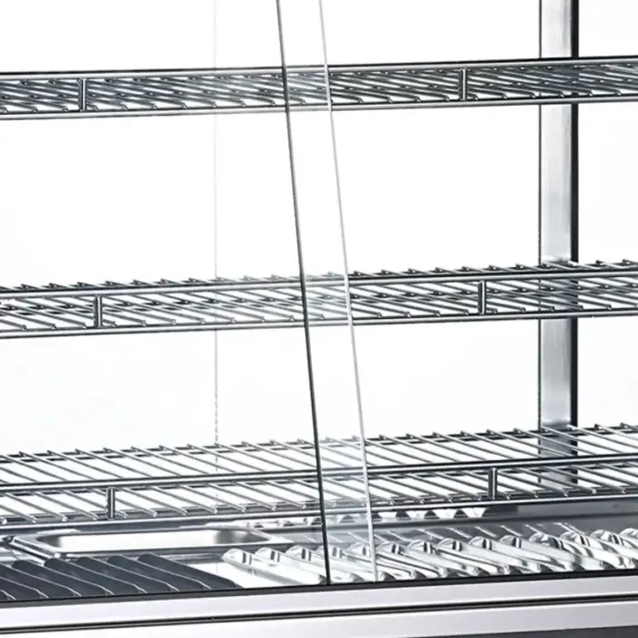 The unit is constructed with durable tempered glass and stainless steel, ensuring it withstands the demands of commercial use.