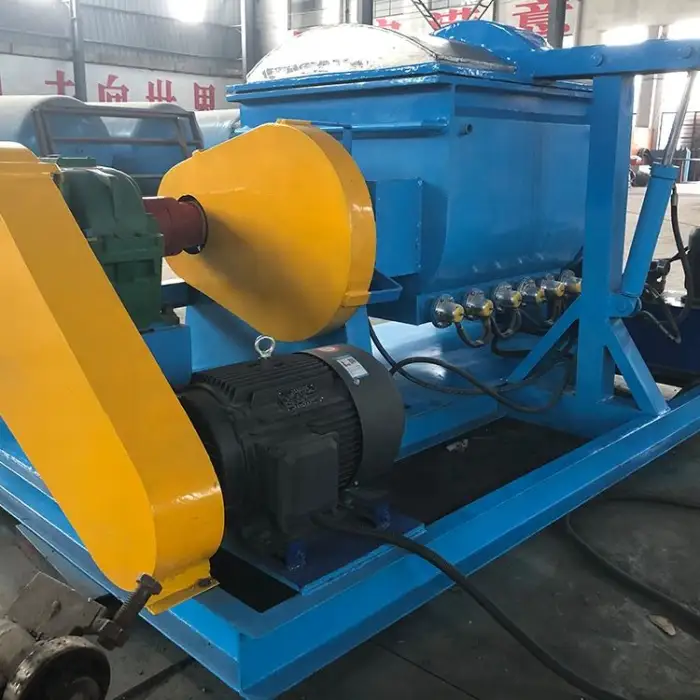 The machine features hydraulic tilting or screw extrusion for efficient discharging of the soap mixture.