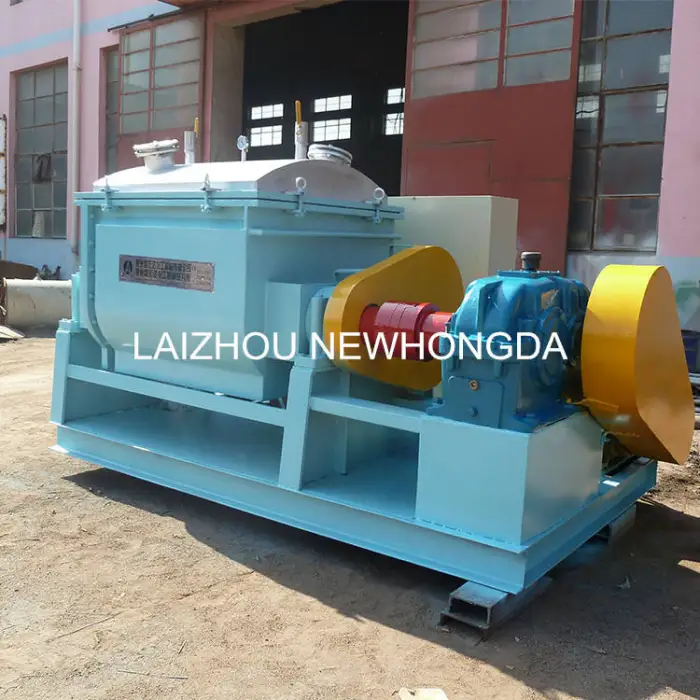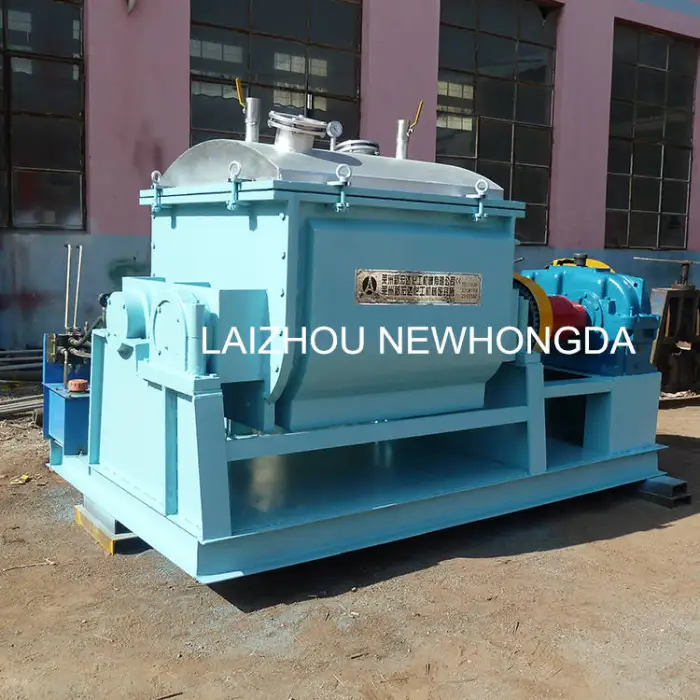 The machine uses Sigma or Z-shape blades to ensure thorough mixing of ingredients, resulting in a consistent soap mixture.