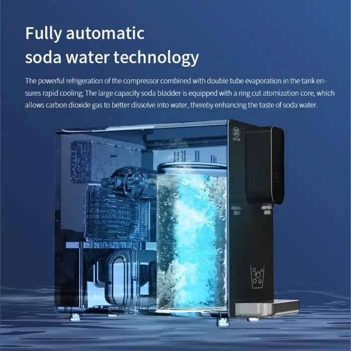 Key features include easy operation, energy-saving design, automatic sparkling water production, and child lock.