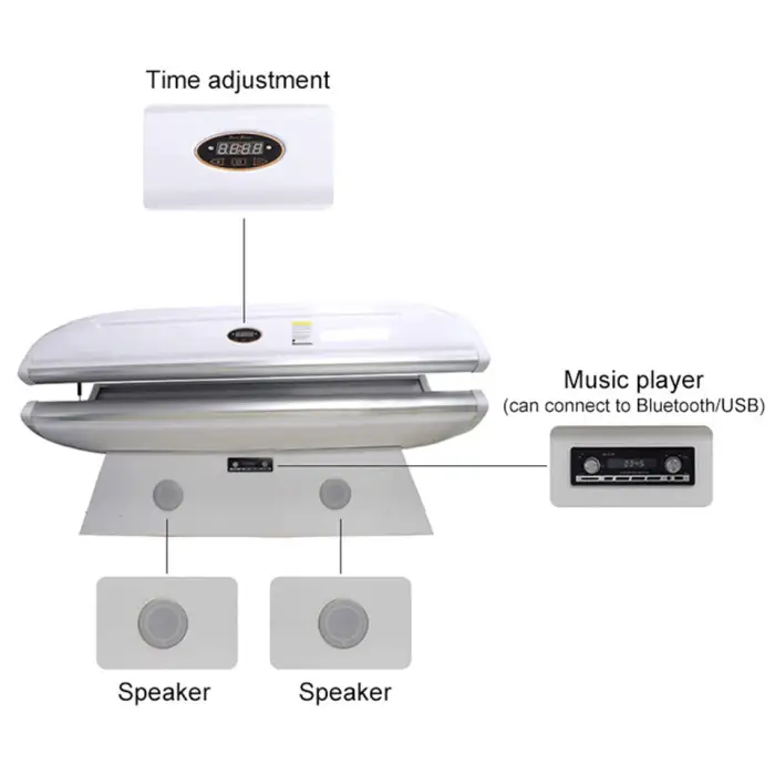 The tanning bed is constructed from high-quality acrylic and ABS materials, ensuring durability and longevity.