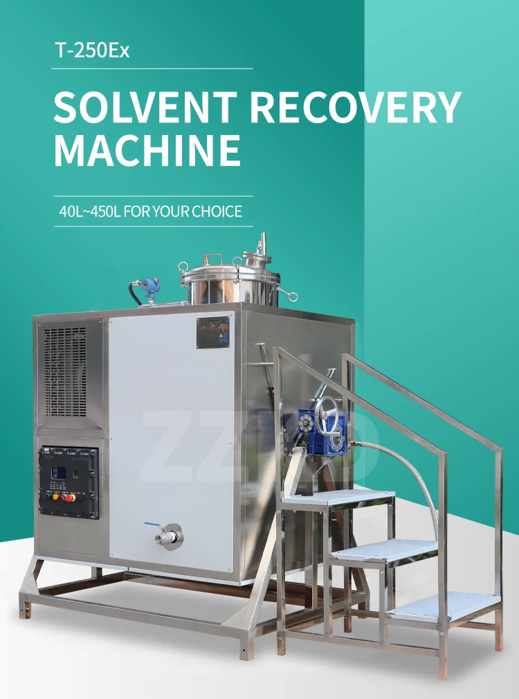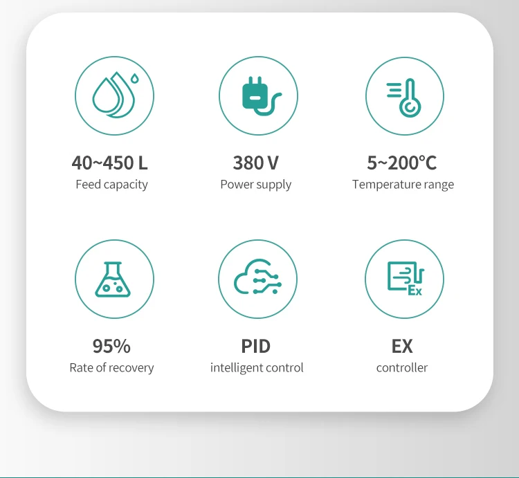 The equipment operates within a temperature range of 5-200°C, allowing for precise control during the solvent recovery process.