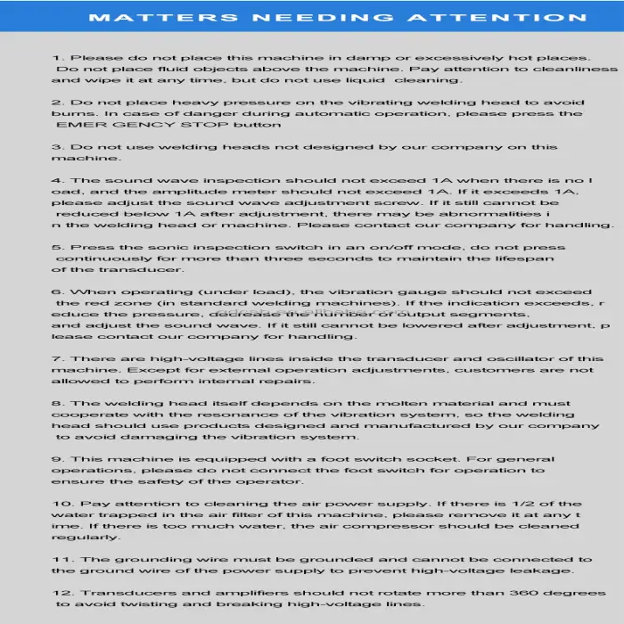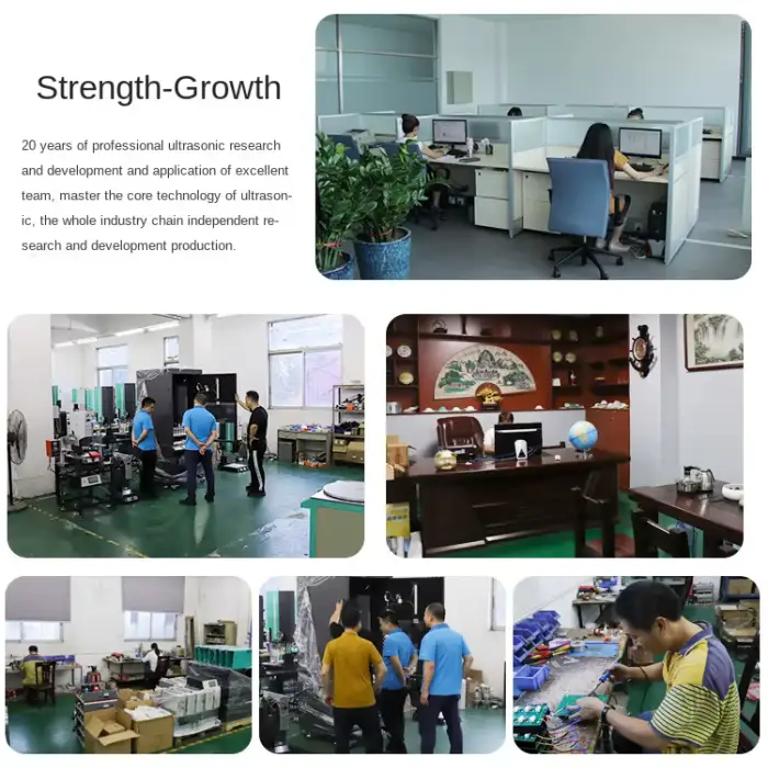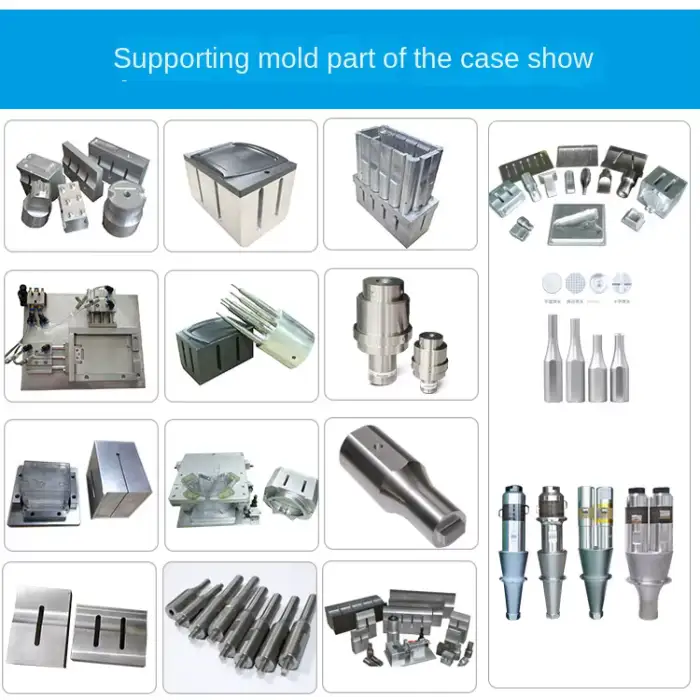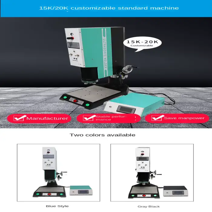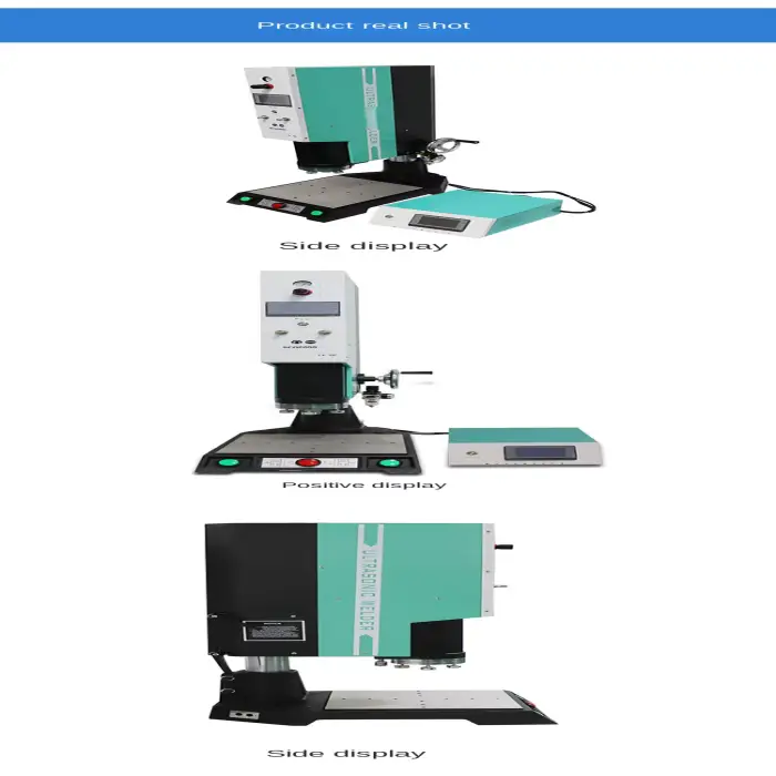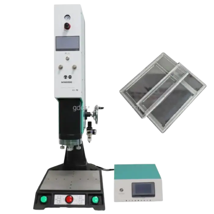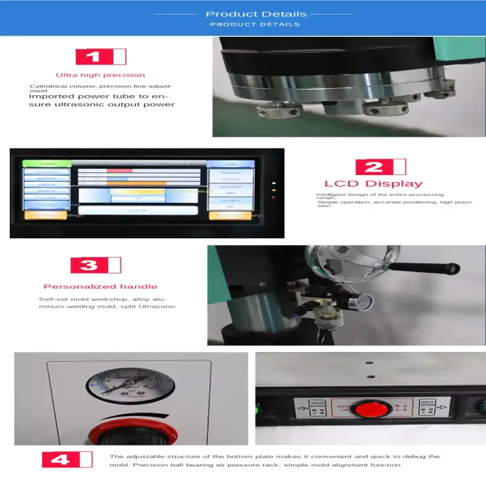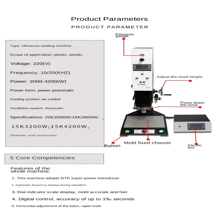 Key features include advanced ultrasonic technology for precise grading, fast operation with a power output of 2600 W, a compact and robust design, and an adjustable welding area suitable for various plastic materials.