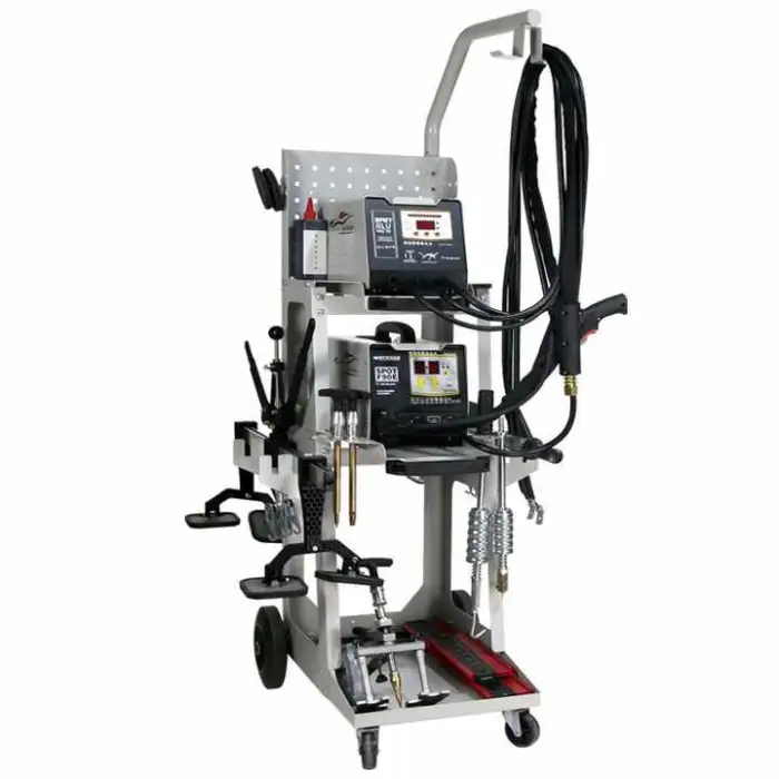 The sturdy construction, strong lifting capacity, and compact worktable design all contribute to the efficiency of the Spot & Stud Welder in straightening car bodies.