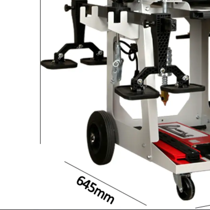 The worktable measures 645mm in length and 420mm in width, offering a compact yet effective working surface.