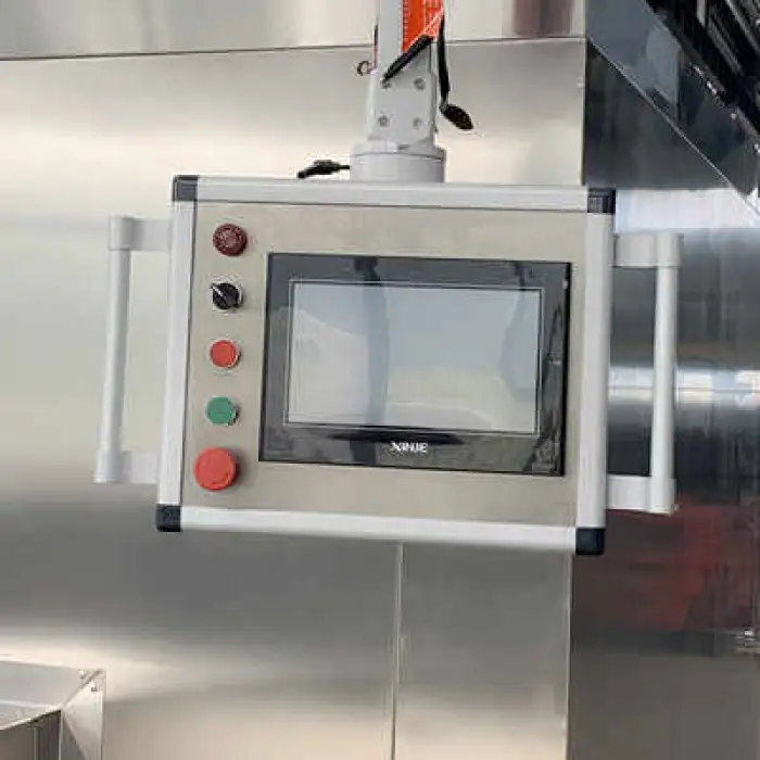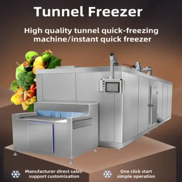 The SSD-300 is a tunnel-style IQF (individually quick freezing) small blast freezer designed to rapidly freeze chicken and other food items while maintaining product quality. It features advanced temperature control, stainless-steel construction, and a conveyor belt for continuous processing.