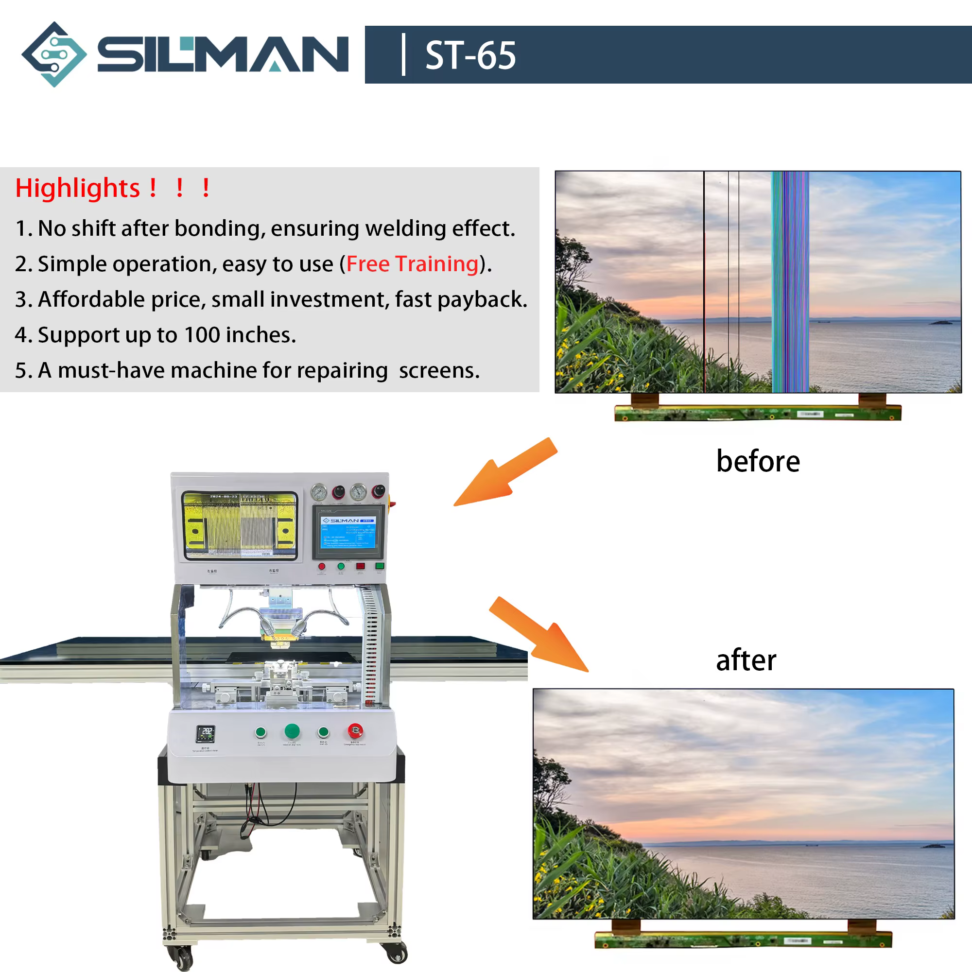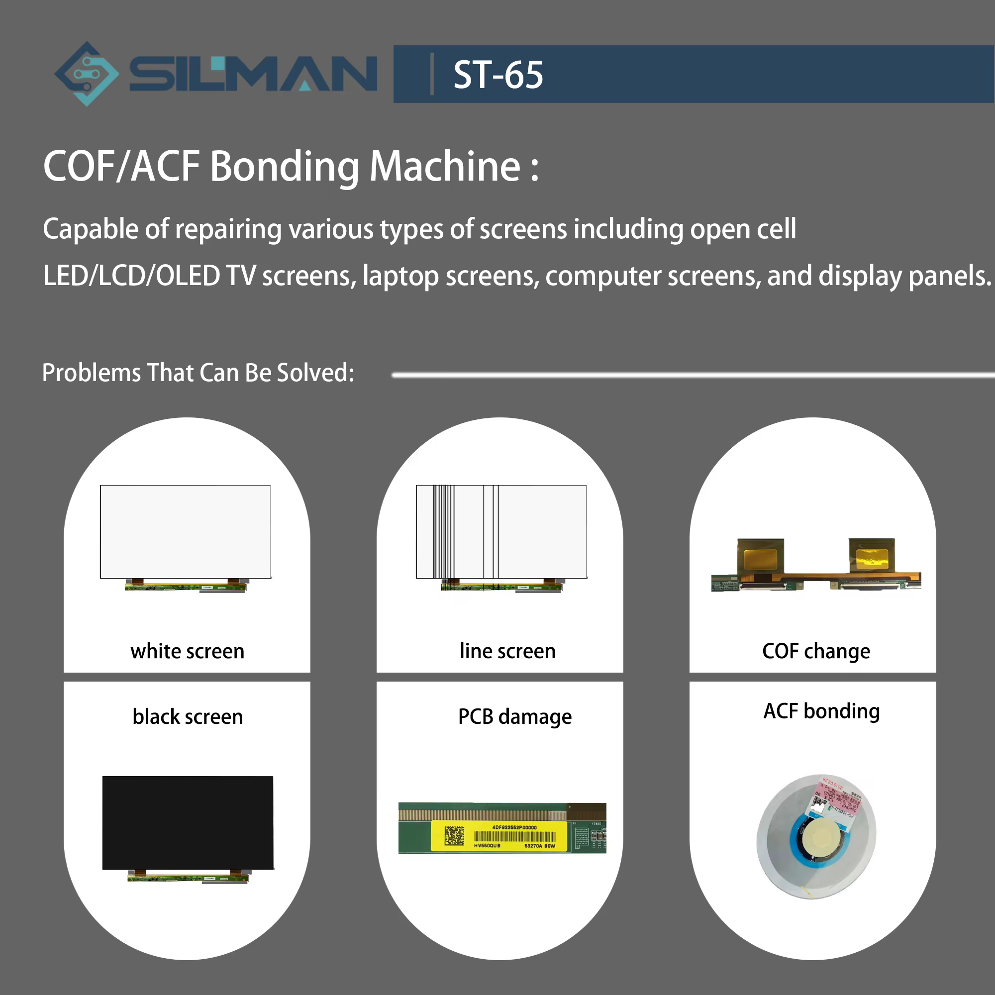The ST-65 Silman Mini Tab ACF Bonding Machine is primarily designed for repairing LCD screens and LED panels by bonding flex cables quickly and accurately.
