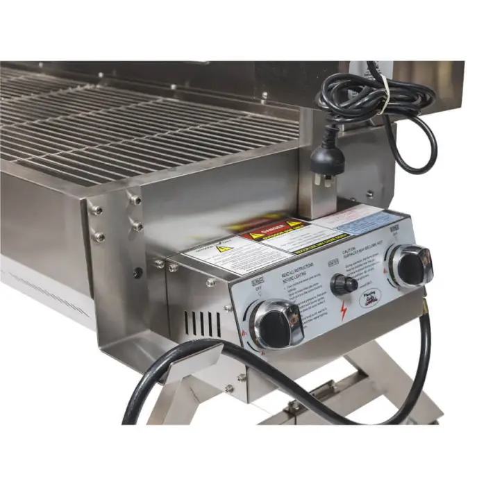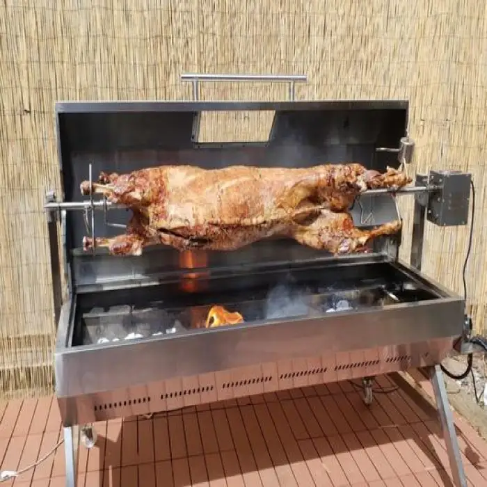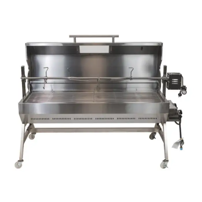 Because it's stainless steel, cleaning is straightforward: remove excess grease, wipe down surfaces with warm soapy water, and rinse. Remove and clean drip trays and spit components after each use. Avoid soaking or direct high-pressure water on the motor and ignition components; follow the maintenance section in the manual for electrical parts.