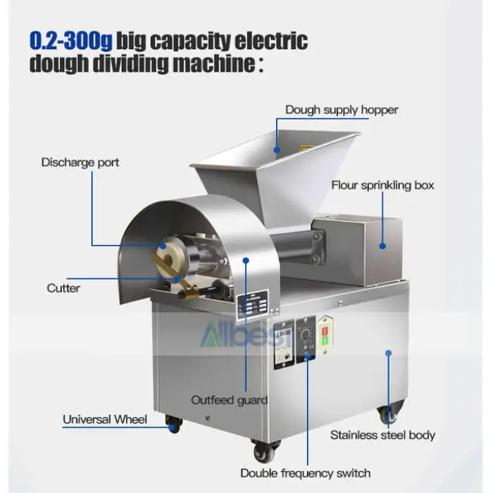 This is a stainless steel automatic desktop dough cutter, divider and rounder designed to cut and form 200 gram bread dough balls quickly and consistently for commercial use.