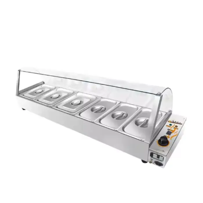 This commercial electric bain marie has 6 basins, stainless steel construction, a glass cover, 1.5 kW power rating, and is rated for 220V, 50Hz. Overall dimensions are 690 x 630 x 235 mm. Net weight is 14 kg and gross weight is 15 kg.