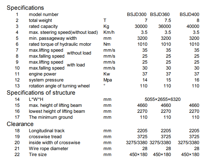 The BSJD300 container crane features a maximum steering angle of 110 degrees, allowing for flexible maneuverability.