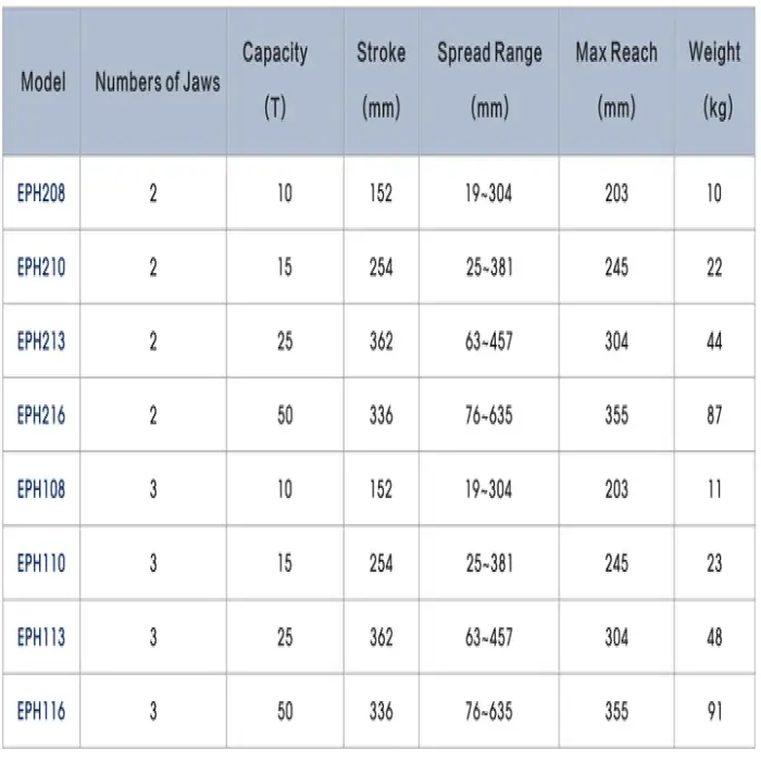 The Steel Hydraulic Bearing Puller Set has a maximum capacity ranging from 10 to 50 tons.