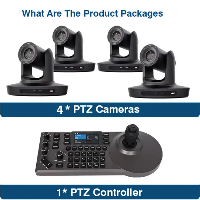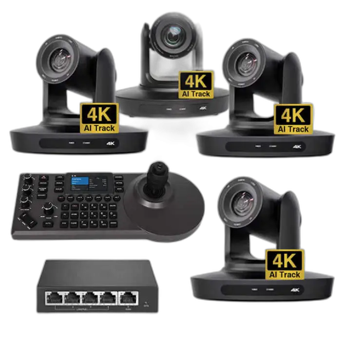 The Studio Broadcast Camera Bundle includes four 4K PTZ cameras, a joystick controller for easy operation, and necessary cables to set up the system.