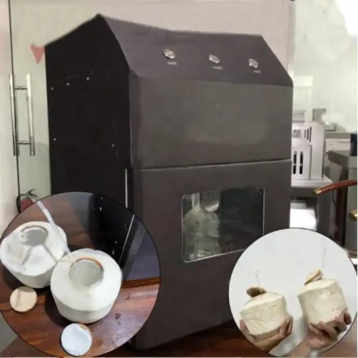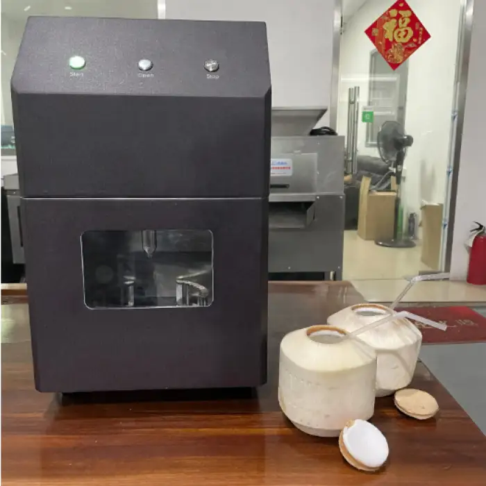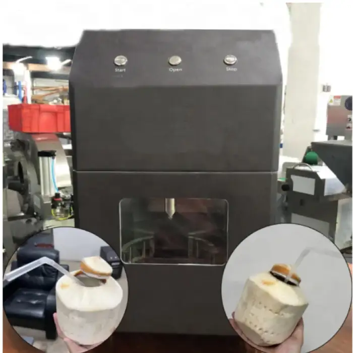 The machine opens a green coconut in approximately 15–20 seconds per piece.