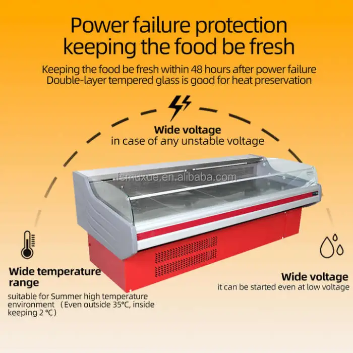 It’s an open display chiller (model MX-XRG2500FC) designed for supermarkets, shopping malls, delis and butcher shops to showcase fresh fish and meat while maintaining safe temperatures and attractive presentation.