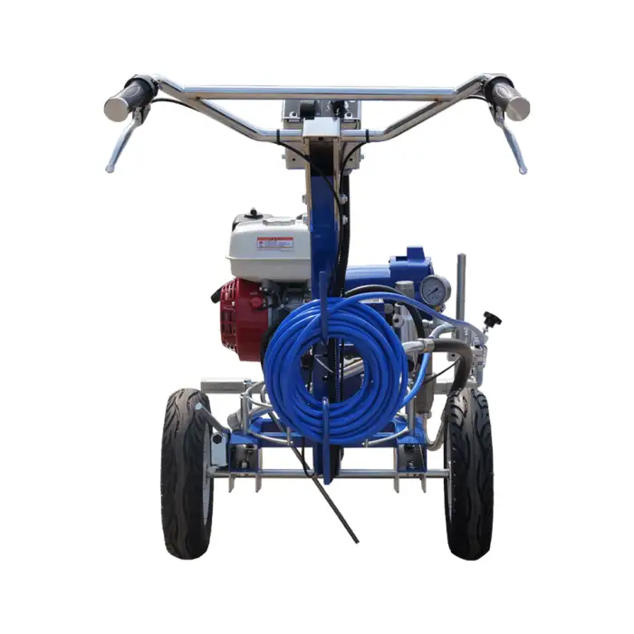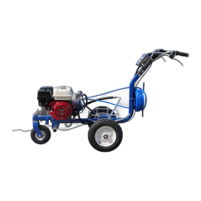 It is a cold spray road line marking machine (model GK3400) by Gukem. Engine-driven with a maximum pressure of 3300 psi, it is designed for applying durable, clear road markings on a variety of surfaces.