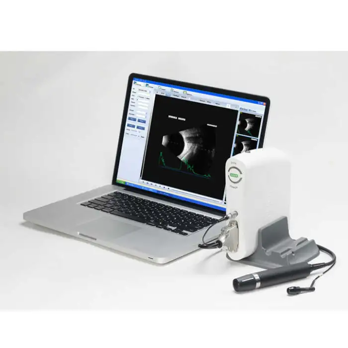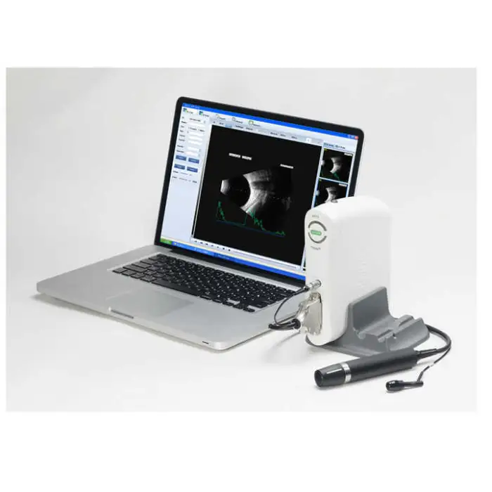 The device uses A/B scanning technology with a B-scan frequency of 10 MHz. It performs sector scanning and offers multi continuous and real-time magnification for detailed imaging.