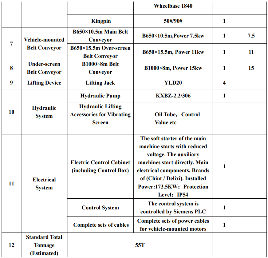The main belt conveyor is 1*B650x10.5m, the over-screen conveyor is 1*B650x15.5m, and there are additional conveyors with dimensions 1*B1000x8m and 2*B500x15m.
