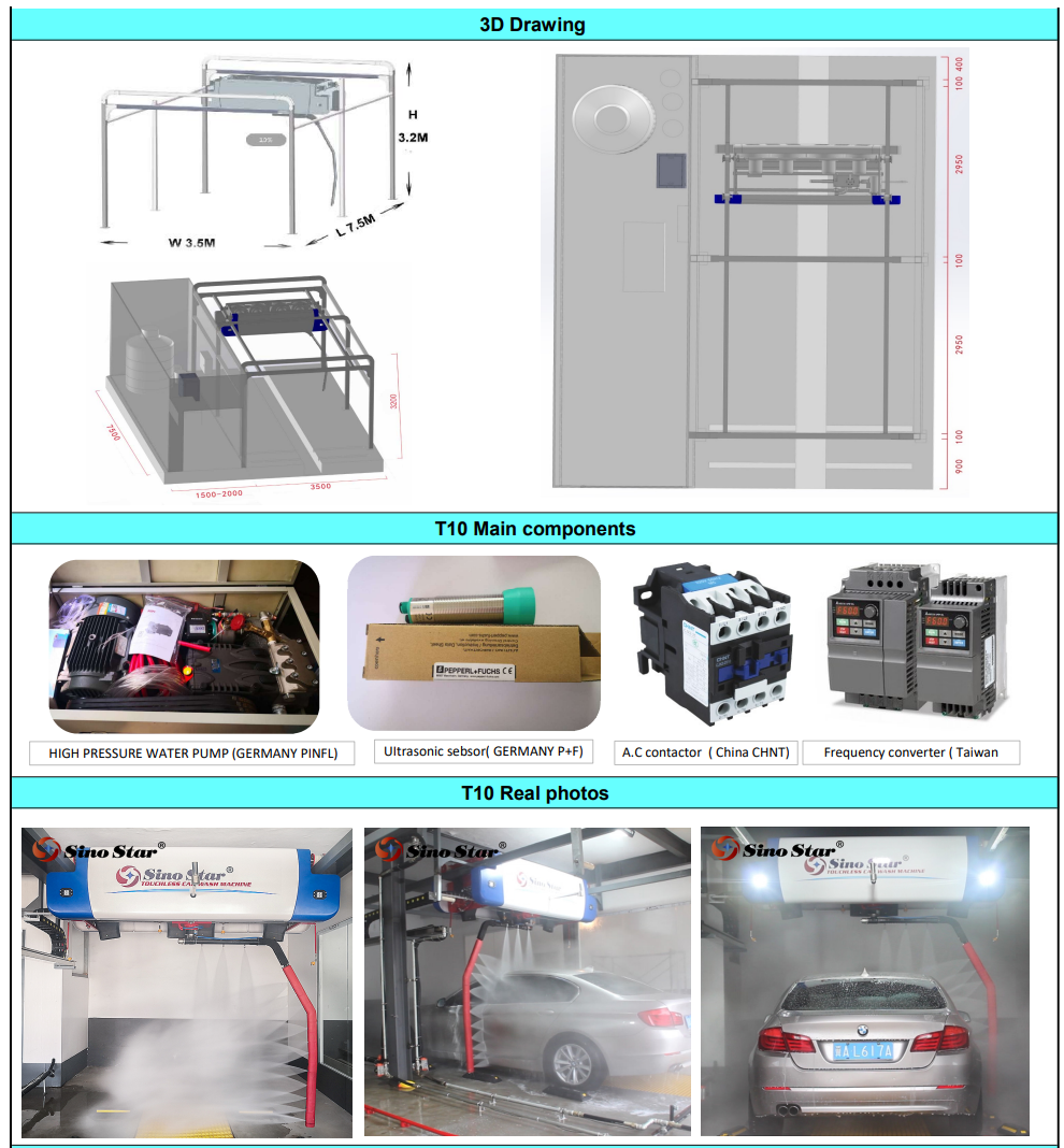The T10 features advanced 3D detection sensors, a fully automated system, and significantly lower water and energy consumption compared to traditional car wash methods.
