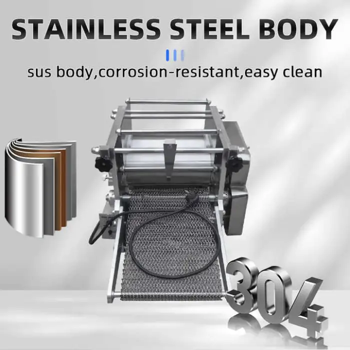 The machine is constructed from durable 304 stainless steel, ensuring longevity and ease of cleaning.