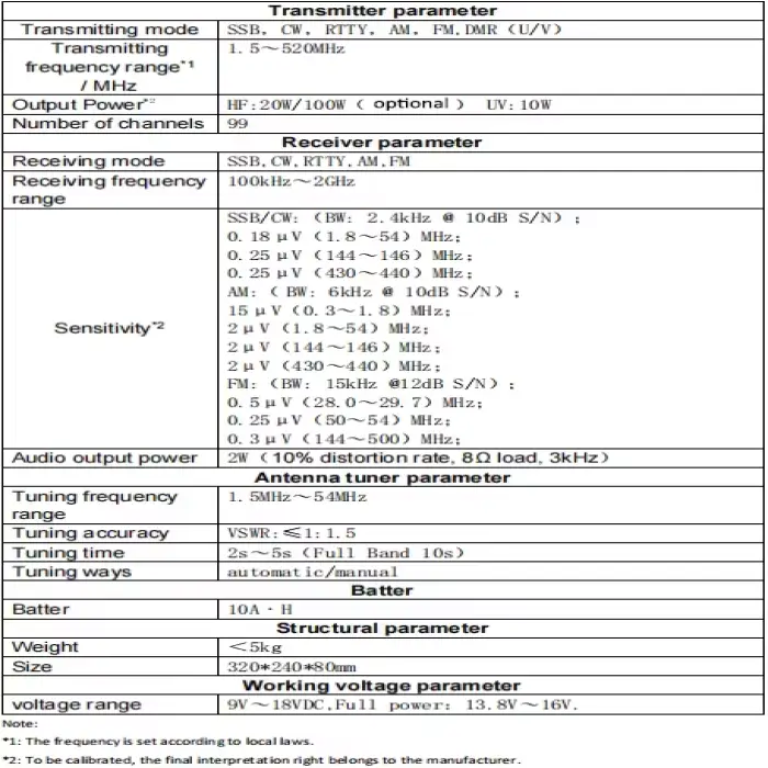 The output power is 20W/100W for HF (with optional modules) and 10W for UV.