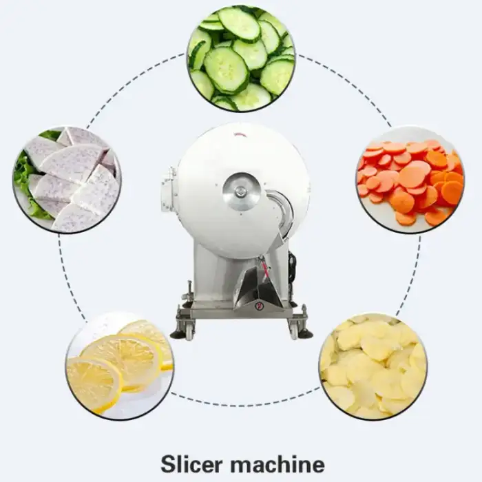 The slicer is built from industrial-grade materials designed for durability and hygiene—typically stainless steel and food-grade components—to withstand continuous commercial use and easy cleaning.