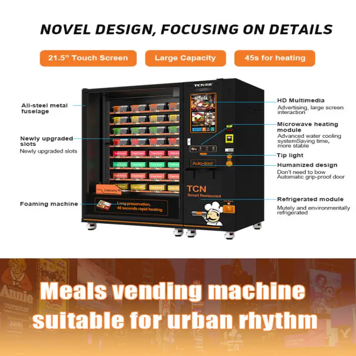 The vending machine can heat food from ambient temperature up to 80°C using its integrated microwave heating system.